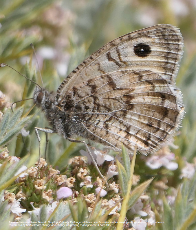 Species that live solely on mountain tops are especially threatened, for example, three Endangered endemic species in the mountain ranges of southern Spain: Zullich’s Blue Agriades zullichi, Nevada Blue and Andalusian Anomalous Blue Polyommatus violetae. Eight montane (mountain) species in Spain have also been added as Near Threatened because recent climate models predict that they will lose most of their climate space in the next 50 years (Romo et al., 2023). Some endemic species are extremely rare.