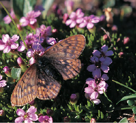 Climate change is also threatening another suite of mainly Holarctic species in the northern Alpine/Boreal zones where warmer and drier conditions are allowing scrub to spread and encroach on sensitive bog and tundra habitats. Several species are now classed as Endangered as a result, including Arctic Blue Agriades aquilo, Freija Fritillary Boloria freija, Arctic Ringlet Erebia disa and Arctic Grayling Oeneis bore (which were assessed as Least Concern in 2010); Arctic Fritillary B. chariclea, Lapland Fritillary Euphydryas iduna (Near Threatened in 2010); Polar Fritillary B. polaris (Vulnerable in 2010); and Dusky-winged Fritillary B. improba (Endangered in both assessments). In the Mediterranean region, climate change is adding new threats to species because of the increasing frequency of extreme drought and wildfires. This is threatening several endemic species that are confined to islands such as the Critically Endangered Karpathos Grayling Hipparchia christenseni (on Karpathos), as well as the Endangered Gran Canaria Grayling H. tamadabae (Gran Canaria), La Palma Grayling H. tilosi (La Palma), and Canary Brimstone Gonepteryx cleobule (Canary Islands).